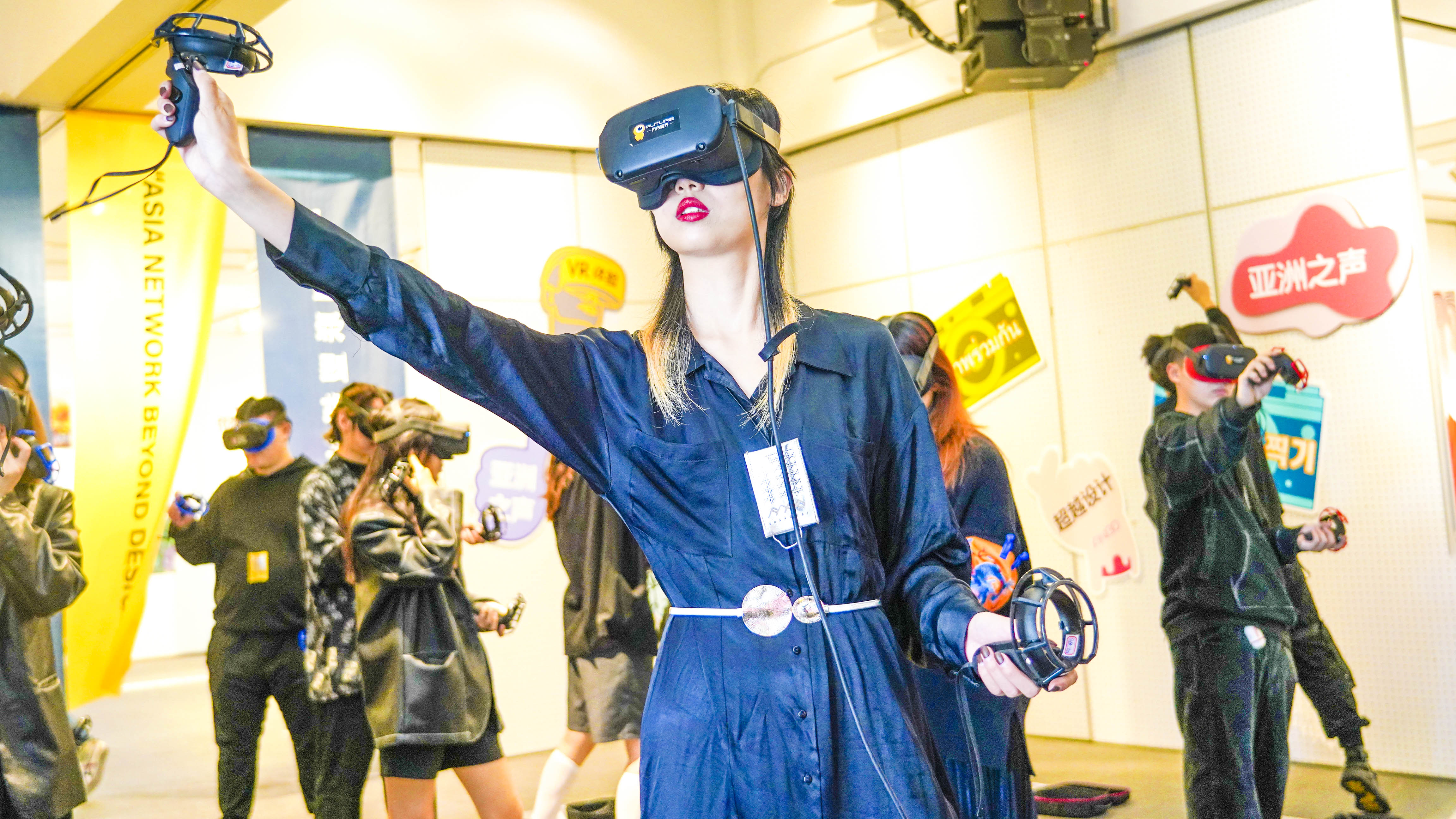 在“东华活动周”的“亚洲联盟超越设计作品展”上,一处融合了新媒体、空间艺术和动态影像的沉浸式VR涂鸦体验区前排满了等待体验的观众。戴上VR眼镜,舞动起手柄,在场观众就变身艺术创作者之一,想你所想,创你所创,给予观者身临其境的艺术感受。