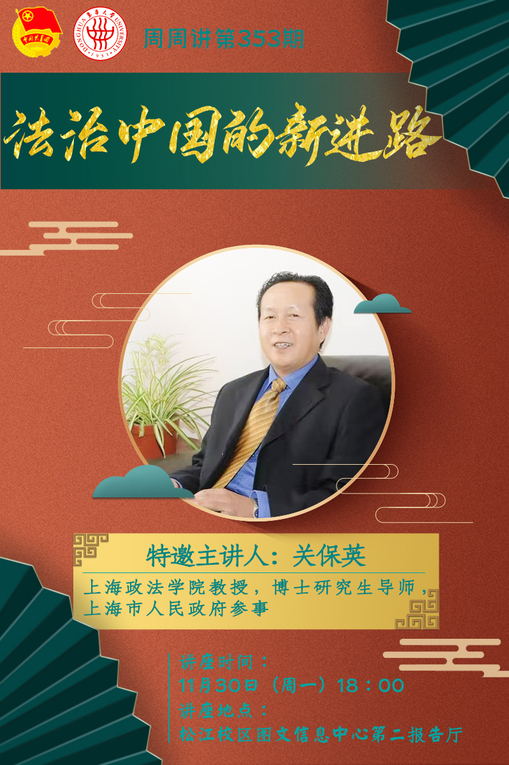主讲人:关保英,上海政法学院教授(二级),博士研究生导师,上海市人民政府参事,曾任上海政法学院副校长。现担任教育部重大攻关项目首席专家;中国体育法学研究会副会长;中国法学会行政法学研究会学术委员会副主任;中国行政执法研究会副会长;上海市人民调解法治研究会会长;上海市法官检察官遴选(惩戒)委员会委员;上海市规范性文件审查中心主任。曾任教育部教学指导委员会委员。