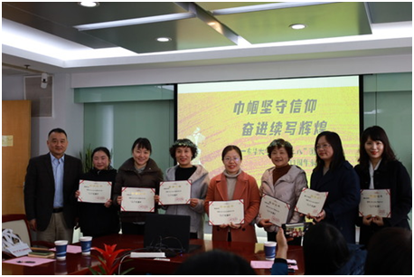 陆湘群宣读2020年我校获上海市教育系统和学校的三八红旗手和三八红旗集体,以及被推荐为上海市三八红旗手和三八红旗集体候选对象的名单。