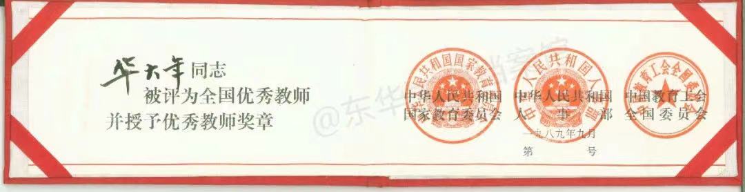 (1989年华大年教授获全国先进工作者证书、奖章)
