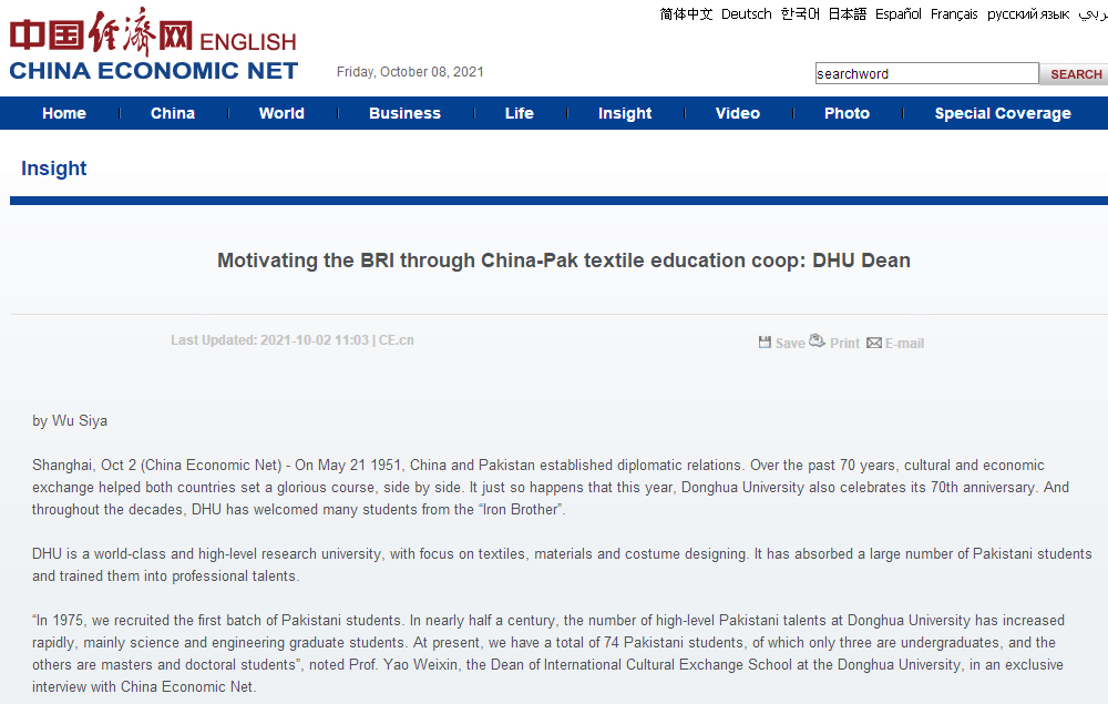 “In 1975, we recruited the first batch of Pakistani students. In nearly half a century, the number of high-level Pakistani talents at Donghua University has increased rapidly, mainly science and engineering graduate students. At present, we have a total of 74 Pakistani students, of which only three are undergraduates, and the others are masters and doctoral students”, noted Prof. Yao Weixin, the Dean of International Cultural Exchange School at the Donghua University, in an exclusive interview with China Economic Net.