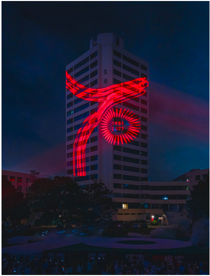 学校老师、学生、校友一同攻关,采用3D 投影技术的艺术形式,点亮学校延安路校区的标志性建筑第三教学楼。学校的发展历程、重要成果、师生和校友风貌、校园文化、美好祝福等要素通过艺术再表达,在楼面上一一展现出来。与此同时,本次情景秀将多样的艺术形态融到整体的艺术表现中,灯光秀、建筑景观照明、灯光装置、时尚设计秀、国风音乐秀等“合奏”的声光影的“交响乐”,为学校70岁生日献上最真挚的祝福。