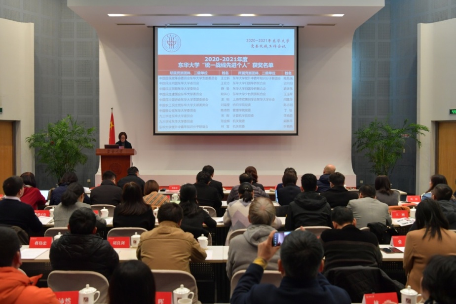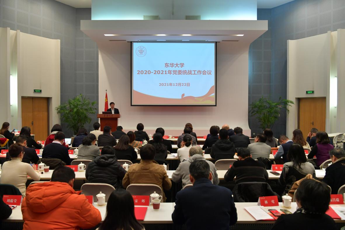12月22日,学校党委召开2020-2021年统战工作会议,回顾总结两年来统一战线工作成绩并部署下阶段重点任务,强调要以习近平新时代中国特色社会主义思想为指导,深入学习贯彻《中国共产党统一战线工作条例》,进一步加强党的集中领导,围绕“凝心集智聚力”目标,传承、创新、突破,努力开创新时代统战工作新局面。校长俞建勇,党委副书记刘淑慧、崔运花,副校长邱高、李炜,党委常委、宣传部部长任晓杰出席会议。会议由党委常委、统战部部长朱英主持。