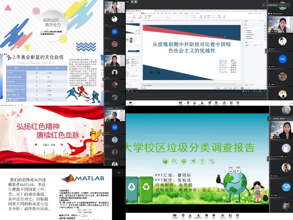 思政课教学内容多、价值引领性强,如何根据课程性质和特点有效做好在线教学,需要教研室层面发挥协同组织作用。教研室作为各门思政课在线教学方案设计及其实施的基本单元,多次召开线上集体备课会,调整和完善原有教学计划安排,切实为在线教学提供组织保障。马克思主义基本原理教研室开展线上思政课教学具有一定的基础,教研室成员已完成30个教学视频录制,2021-2022年秋季学期完成线上线下混合式试点,此次在线教学除了发挥自身特色资源外,积极拓展选用首届全国高校思政课教学展示视频、习近平重要讲话数据库等供教师选用。思想道德与法治教研室在“教学组织有序”“教学管理严格”“师生互动高效”三项原则的基础上,教研室成员群策群力、互帮互助,精挑细选线上教学视频资料,同时科学调整教学内容,将课程的法律部分更加适合网课的内容调整到前面来讲,体现课程教学的灵活性。中国近现代史纲教研室为增强教学互动性,以超星平台为依托,教师均配置了腾讯会议进行互动,实现课程讲述、解析答疑、作业练习等环节有效衔接。毛泽东思想和中国特色社会主义思想概论教研室及时加强青年教师在线教学技术操作辅导,切实拓展在线教学资源,教师们互相分享教学资源,合力推进在线教学实施。形势与政策教研室课堂教学突出主题性、突出时效性、突出互动性,合理设置疫情防控内容融入相关教学专题,如世界主要国家应对举措及其效果,深入阐析2022年政府工作报告关于在防疫抗疫中努力实现经济社会预期发展目标的内容,通过社会现实问题来实现对学生的引导。