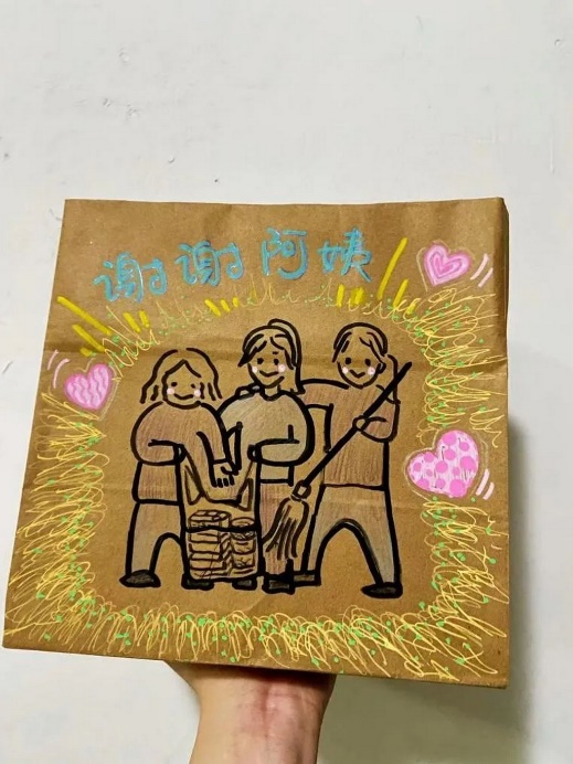 因为无法时时在门岗等候,温子昕就拜托楼里阿姨帮忙盯着,如果饭来了、物资来了,直接给她发消息或者打电话。只要听见她们喊“温总,快下来!”,温子昕就立马戴好口罩、拿好钥匙“咚咚咚”地跑下楼去。