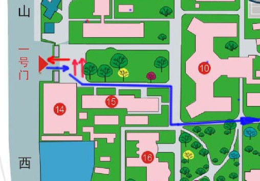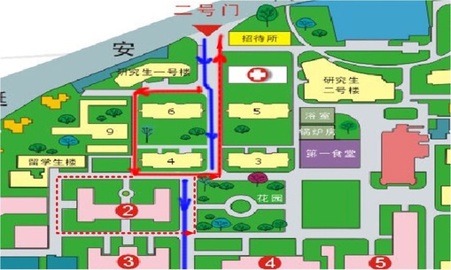 (红线为送新生未审批车辆入校线路;蓝线为校内职工和已审批车辆入校线路)