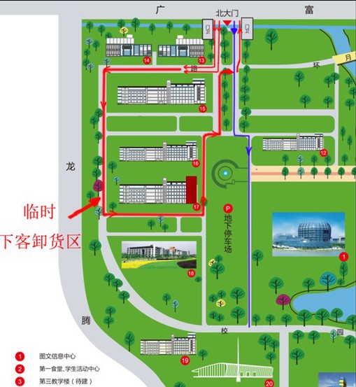 3、对于送新生自驾车,分别设置广富林路门入校缓冲区(见图1)和人民北路门入校缓冲区(见图2)。9月10日-11日禁止校内车辆停放在缓冲区道路上。请全校师生非必要不在缓冲区道路活动。