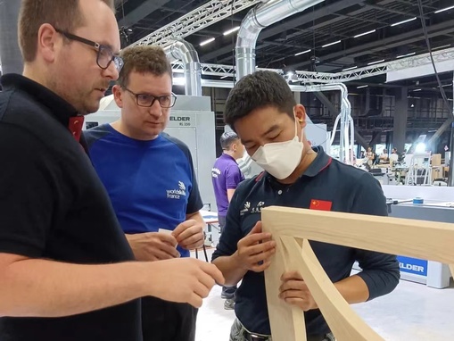 除了选拔、训练参赛选手,余继宏还要负责统筹集训基地所有专家、教练、保障团队人员的各方面工作。每一次的强化训练,都是一个复杂的系统性工程。受疫情影响,2022年世界技能大赛在15个国家分散举办。余继宏带领的精细木工世界技能大赛中国参赛团队,六年磨一剑,在此次瑞士特别赛上,比出了士气,赛出了水平!“对于选手在比赛过程中碰到的技术难题、小的技术失误,我每天裁判工作开始前及晚上回到酒店,都要和选手作技术分析,安抚选手情绪,鼓励他们克服困难,继续前进。只要坚定信心,发扬工匠精神,一步一个脚印把事情做好,每个人都会有所成。”余继宏说到。