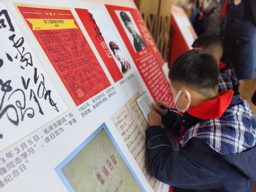 进入红色长廊展厅,首先映入眼帘的是“向雷锋同志学习”这七个字。马克思主义学院硕士生林雯雯担任讲解员,为附校学子生动讲述了雷锋同志一生的光荣事迹,深刻阐释了雷锋精神的内涵。在“走进雷锋”板块中,附校学子深入了解雷锋的成长经历,学习雷锋“金句”以及雷锋精神的形成与发展;在“学习雷锋精神”板块中,附校学子了解到60年来一代代人对雷锋精神的歌颂与传承,英雄虽已逝,精神永远长存;在“新时代篇章”板块中,同学们驻足停留,深受启发。在雷锋精神的影响和启迪下,涌现出袁隆平、张富清、黄大发、黄宝妹、樊诗锦等堪称时代丰碑的楷模。同学们听得津津有味,沉浸于讲解员生动的讲解中,不时拿起纸笔认真地做着笔记,深刻体会雷锋精神人人可为、处处可学。