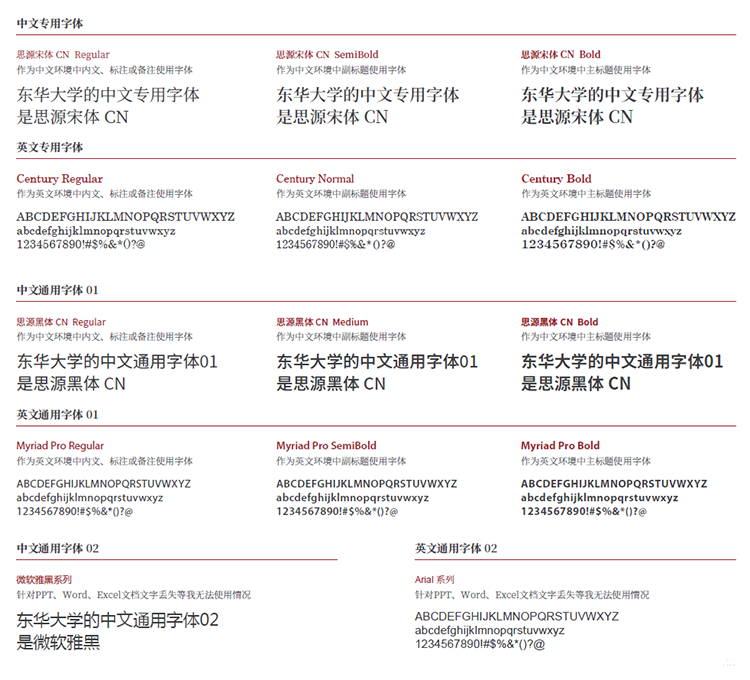 标准字体确立了同等的视觉传达效果,在对外宣传中不可用其它字体代替,但在学校文件等正文中可使用本手册指定的专用字体,使用时请以电子文件或标准样本为依据,保证与学校整体形象统一。