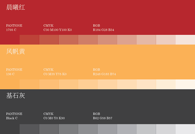 2.在充分使用标准色的基础上,开发出此辅助色彩。辅助色彩由标准色演变而来,色彩的气质、感受与标准色相辅相成,但在识别体系中不占据主要位置。灵活的使用辅助色彩以起到活跃整体气氛与辅助识别的作用,如:可在多媒体、办公用品、宣传品等物料上,可视具体情况选择辅助颜色使用。